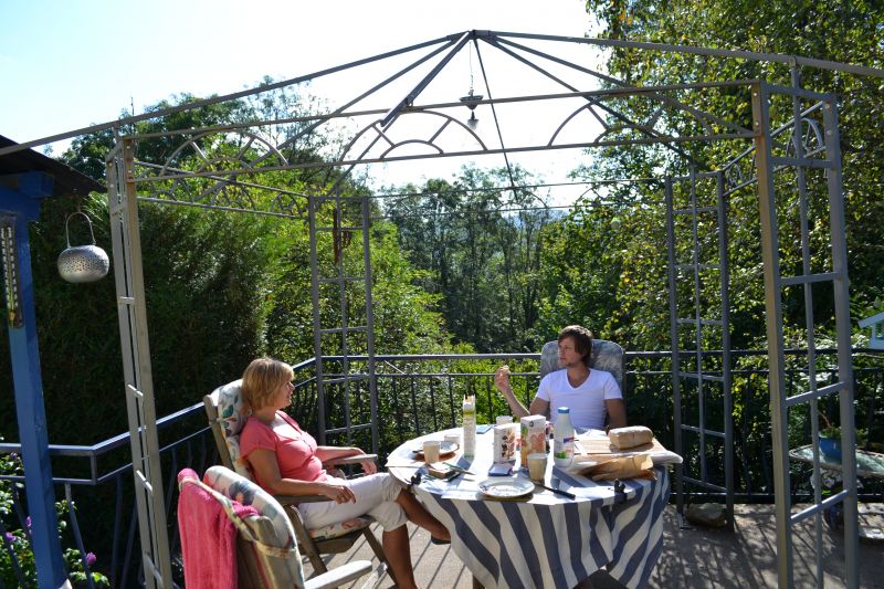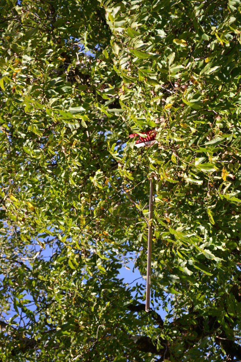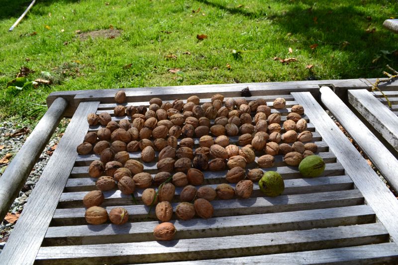 Na een heerlijk ontbijtje in de zon, gingen we even wat walnoten uit de notenboom halen.